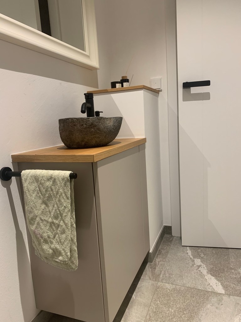 Nach etwas längerer Zeit haben wir jetzt auch endlich ein Waschbecken am WC im Obergeschoss. Der Unterschrank ist von der Firma Wohnformat, das Waschbecken haben wir im Internet bestellet und den Wasserhahn von OBI
